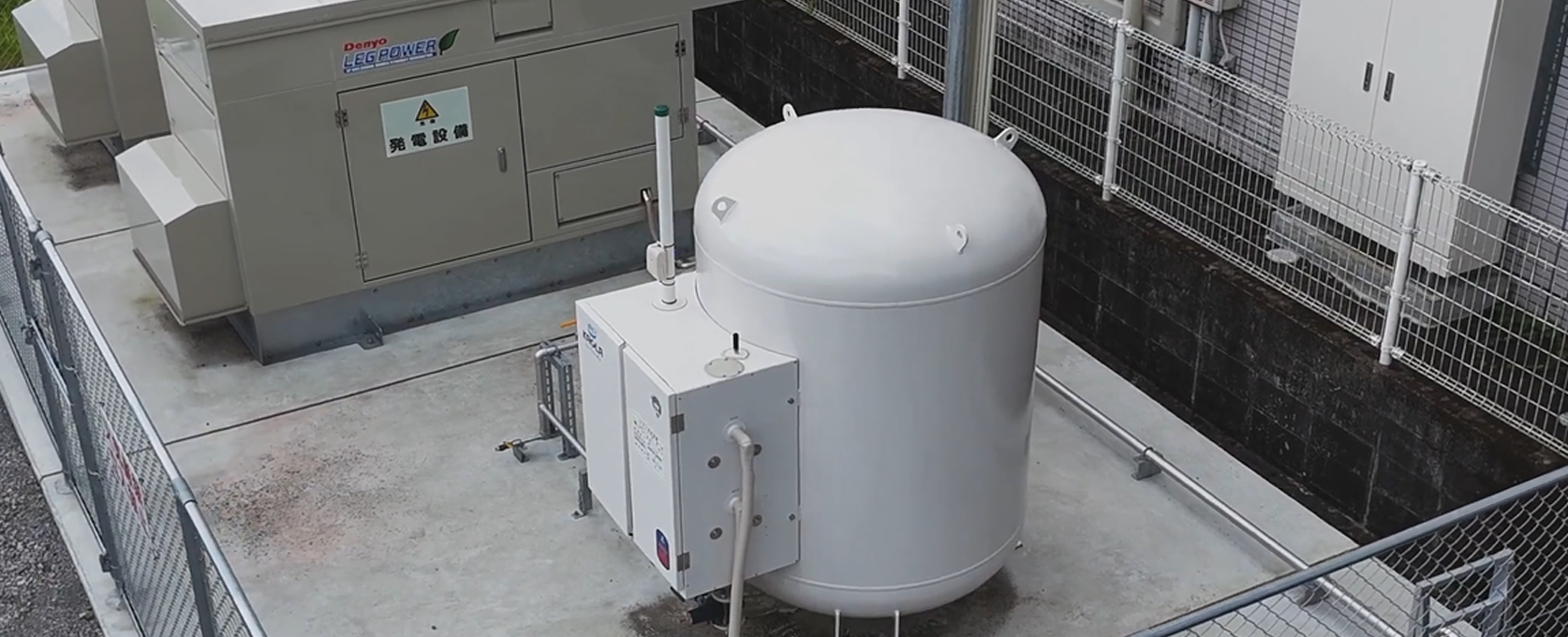 導入のメリットは大きく3つあります。1つ目は、ガスの保存期間が長い点。2つ目は、稼働時の音が小さく、クリーンで環境に優しい点。そして3つ目は、停電が発生した際に1分足らずで発電機が起動する点です。
